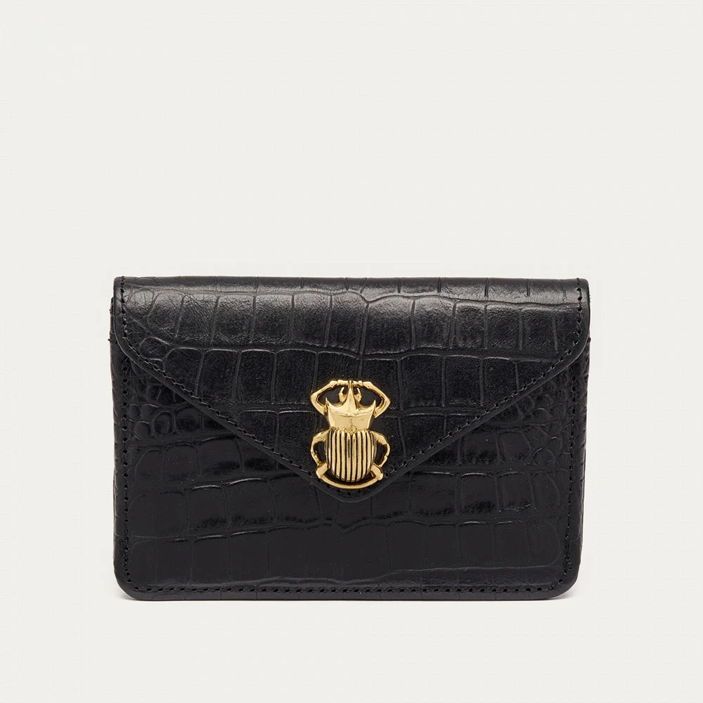 - Cette petite pochette qui prend la forme d’une enveloppe est ornée d’un fermoir en forme de scarabée en laiton