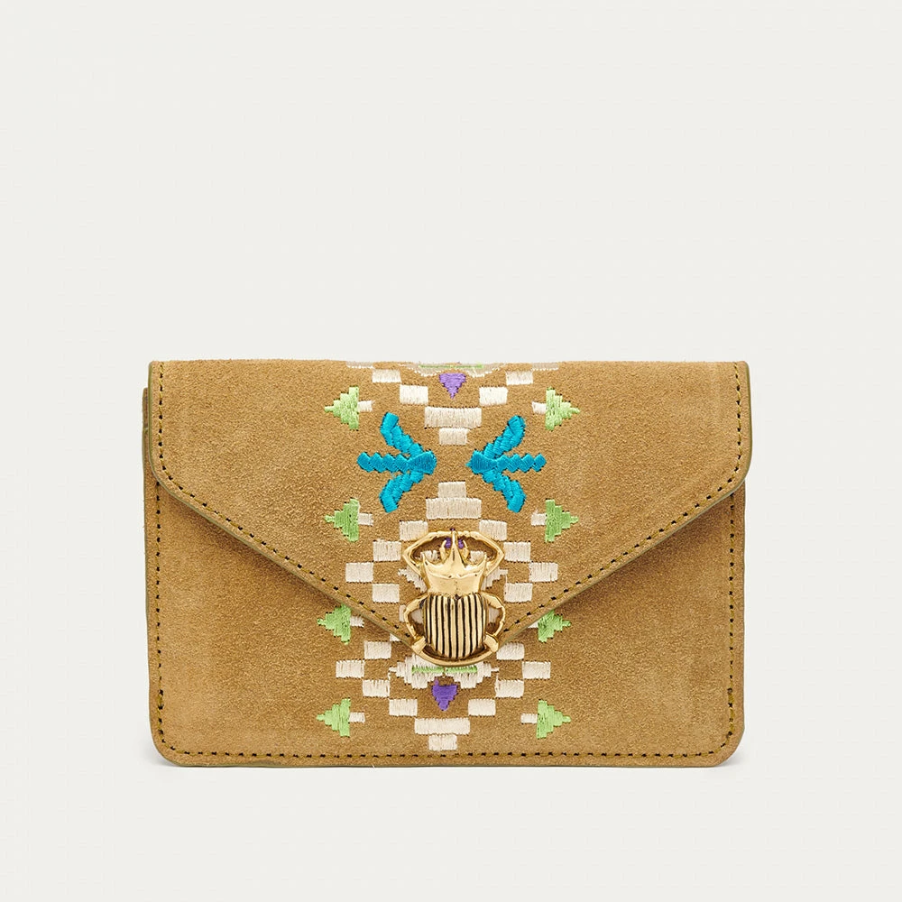- Cette petite pochette qui prend la forme d’une enveloppe est ornée d’un fermoir en forme de scarabée en laiton
