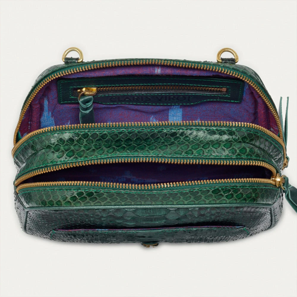- Porté épaule ou croisé, le modèle Clara est organisé en deux compartiments avec une poche interne zipée ainsi qu’une poche à l’avant ornée d’un bijou en laiton prenant la forme d’un scarabée